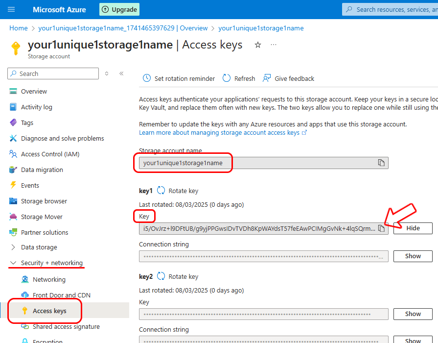 In the resource properties, click on “Access keys” under the “Security + networking” section in the left menu.