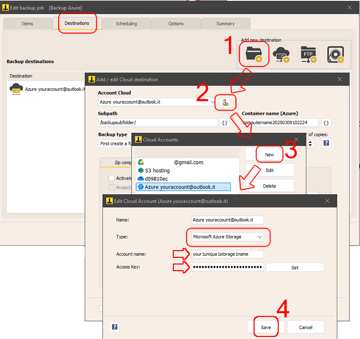 Now that you have the credentials for your Azure storage space, you can add a cloud destination in Iperius Backup by creating a new account for Microsoft Azure, as shown in the image below: