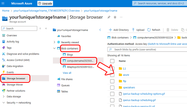Sobald die Sicherung abgeschlossen ist, können Sie die Dateien im Azure Storage sofort mit dem dedizierten Browser anzeigen, der im Azure-Portal verfügbar ist: