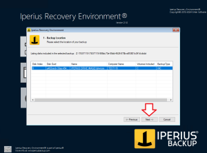 Each row corresponds to a backup, with its main information such as the backup operation name, computer name, included volumes, and backup type. Select the desired backup and click “Next” to continue. If the backup is Full or Patching, proceed to section 3. If the backup is incremental or differential, choose which version to restore.