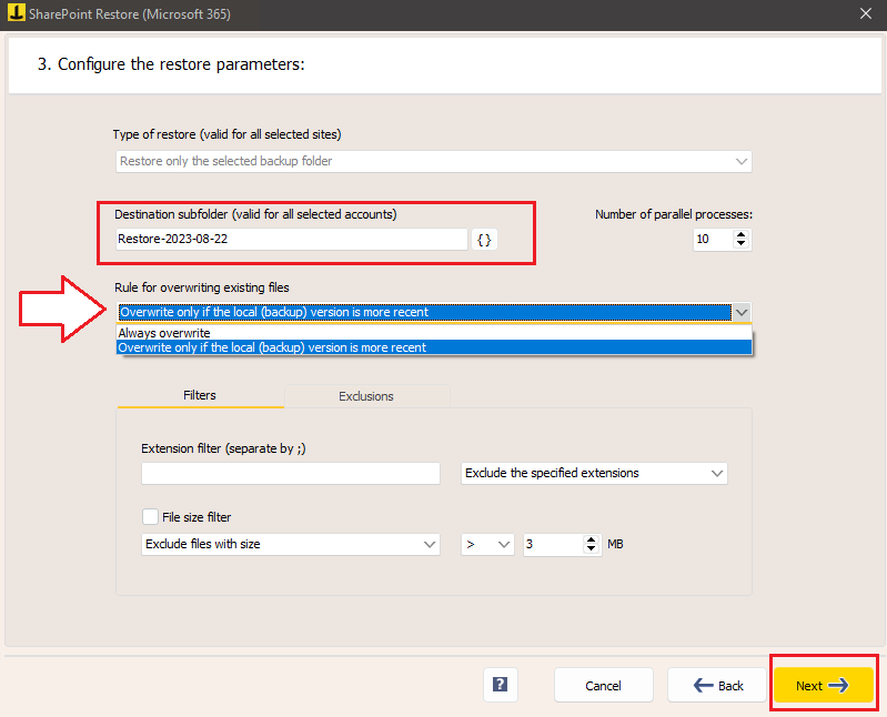 Wählen Sie dann den Namen eines Zielunterordners innerhalb der SharePoint-Sites und entscheiden Sie, ob vorhandene Dateien oder nur diejenigen überschrieben werden sollen, die älter als die lokale Sicherung sind.