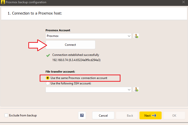 Verbinden Sie sich mit dem soeben erstellten Konto mit Proxmox, damit Sie mit den nachfolgenden Sicherungskonfigurationen fortfahren können (im selben Fenster können Sie auch ein anderes Konto (SSH) für die Dateiübertragung auswählen).