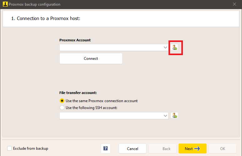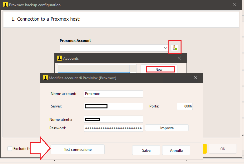 Als ersten Schritt müssen Sie Ihr Proxmox-Konto eingeben und dann die Serveradresse, den Port und die Administrator-Benutzeranmeldeinformationen definieren: