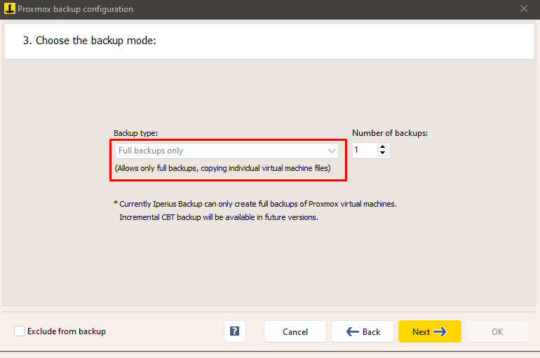 Auf der nächsten Registerkarte können Sie den Sicherungstyp und die Anzahl der aufzubewahrenden Sicherungskopien auswählen: