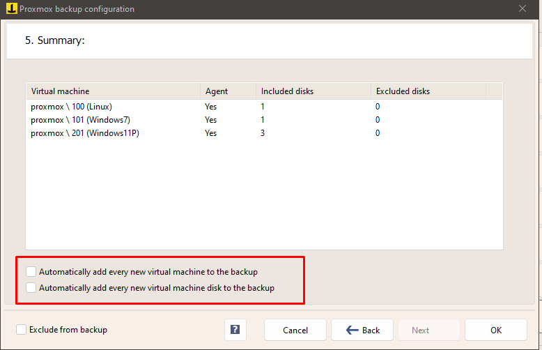 Schließlich können Sie auf der letzten Registerkarte die Zusammenfassung der ausgewählten virtuellen Maschinen sehen und angeben, ob neue virtuelle Maschinen und/oder neue Festplatten virtueller Maschinen automatisch zum Backup hinzugefügt werden sollen (die auch nach der Konfiguration des Backups hinzugefügt werden können):