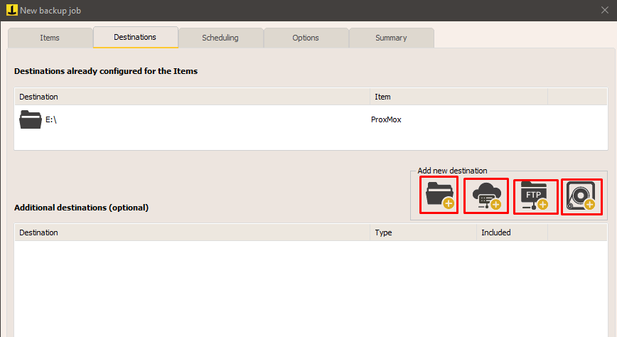 Wenn Sie eine zusätzliche Kopie des Backups der virtuellen Proxmox-Maschine an anderen Zielen erstellen möchten, beispielsweise einem FTP-Server oder einem Amazon S3-Cloud-Speicher, können Sie im nächsten Tab ein oder mehrere Ziele hinzufügen: