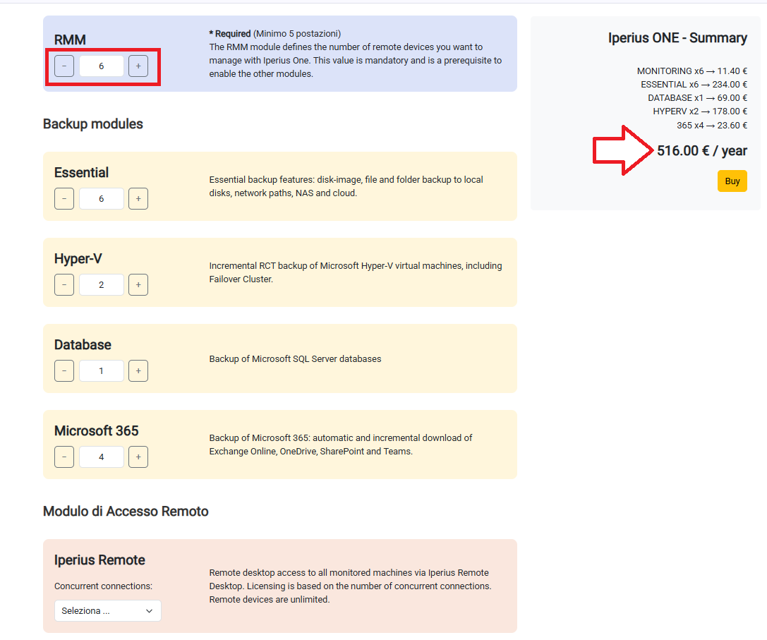 Iperius-One-Lizenzen sind jährlich gültig, und während des Jahres ist es möglich, über den Konfigurator ein Upgrade oder Downgrade der Module vorzunehmen.