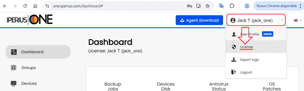 Die zweite Möglichkeit, von Iperius Remote auf Iperius One zu upgraden, besteht direkt über das Iperius-One-Dashboard (https://one.iperius.com), indem Sie sich mit Ihren Iperius-Remote-Zugangsdaten anmelden und zur Lizenzseite wechseln. Dort finden Sie eine spezielle Schaltfläche für das Upgrade: