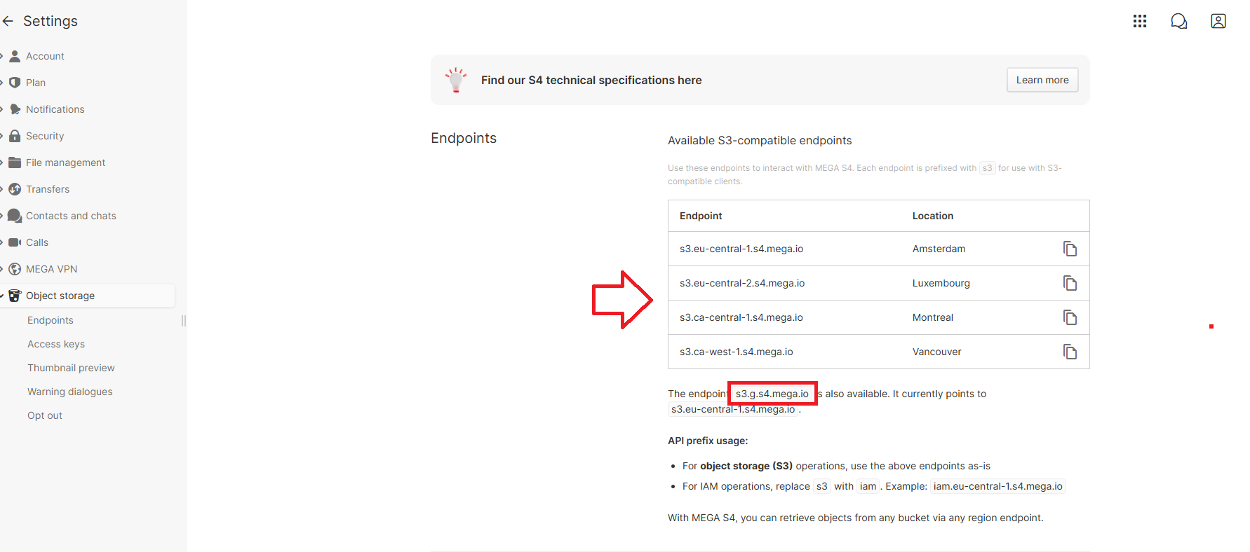 Servicepunkt (URL) : s3.g.s4.mega.io.
