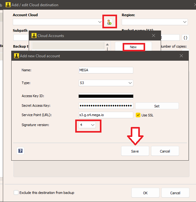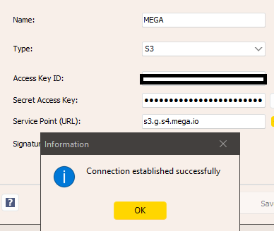 - Fügen Sie ein S3-Konto hinzu und geben Sie Ihre MEGA-Zugangsdaten ein: