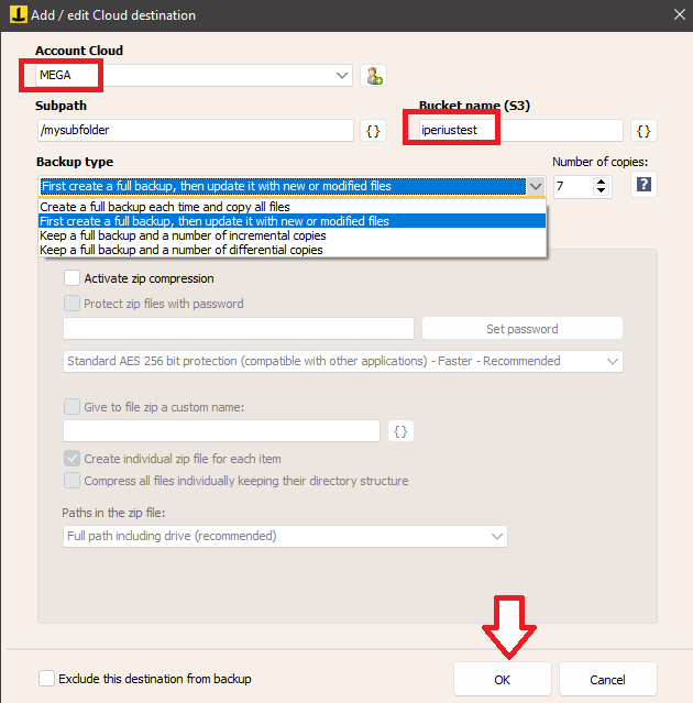 Wählen Sie das neu erstellte Konto aus, anschließend den Bucket-Namen, den Sicherungstyp (vollständig, inkrementell, differentiell) und weitere Optionen (ZIP-Komprimierung, AES-256-Bit-Verschlüsselung, Synchronisierung usw.). Klicken Sie auf „OK“, um das Ziel zu speichern und fortzufahren. Sie können außerdem den Sicherungszeitplan und E-Mail-Benachrichtigungen konfigurieren .