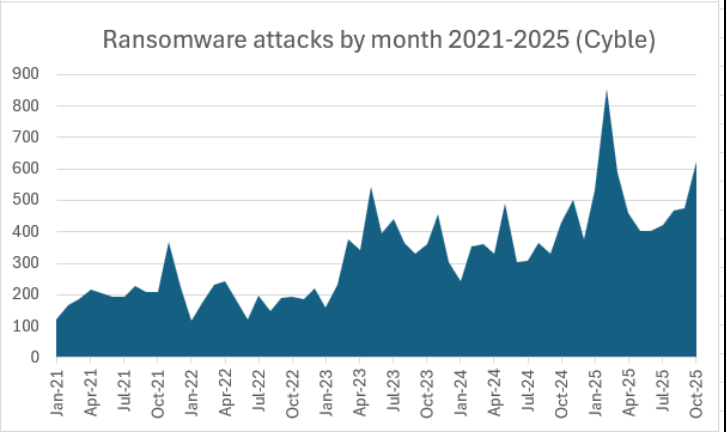 Monatliche Entwicklung der Ransomware-Angriffe (2021-2025) laut Cyble-Daten: Die Grafik zeigt einen Aufwärtstrend mit einem Höhepunkt von fast 900 Angriffen im Januar 2025 und immer noch hohen Werten (>600) zum Jahresende.